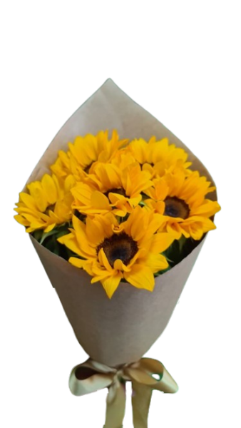 bouquet com girassóis, flores selecionada e delicadamente montado com folhagens e complementos, a embalagem a escolha.
